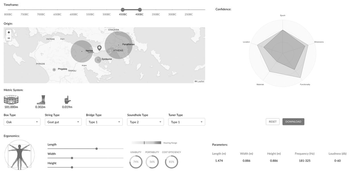 By specifying some initial time range (using the main slider), certain centroids pop up on the Geomap, representing the Classical Stadia (stadiums), where Greek footraces used to take place at the time. Their very existence (together with their corresponding radii of cultural influence) vary with time, based on historical evidence. At different timeframes, the proximities of the user-dropped pin to the stadiums (GPS coordinates) are used as reference to make predictions about its grouping, by employing a fuzzy k-Nearest Neighbor algorithm (assigning degrees of membership to all existent classes). These assignments are then used to restrict the remaining parameters in each scenario, using fast and frugal heuristics; e.g., selecting only eligible materials (that could be found in the wider region during that period), or giving those materials a greater probability of being selected. Another important consideration is the teleon (perfect) numerical partition scheme induced by the presumed influencing stadium, which directly affects the acceptable dimension ratios. Although a single common metric system was known to be used across all Ancient Greece, relative proportions for measuring length such as daktylos (thumb) or pous (foot) are essentially taken to be proper divisors of individual stadion (stadium) variants, resulting in slight subdivision differences. All these are reckoned with usability/portability constraints, as well as the Greeks’ notorious passion for efficiency and flair for minimalistic design (avoiding extremities) best captured in the famous quote “Metron Ariston (moderation is best)” which was attributed to Cleovoulos (6th century BC).